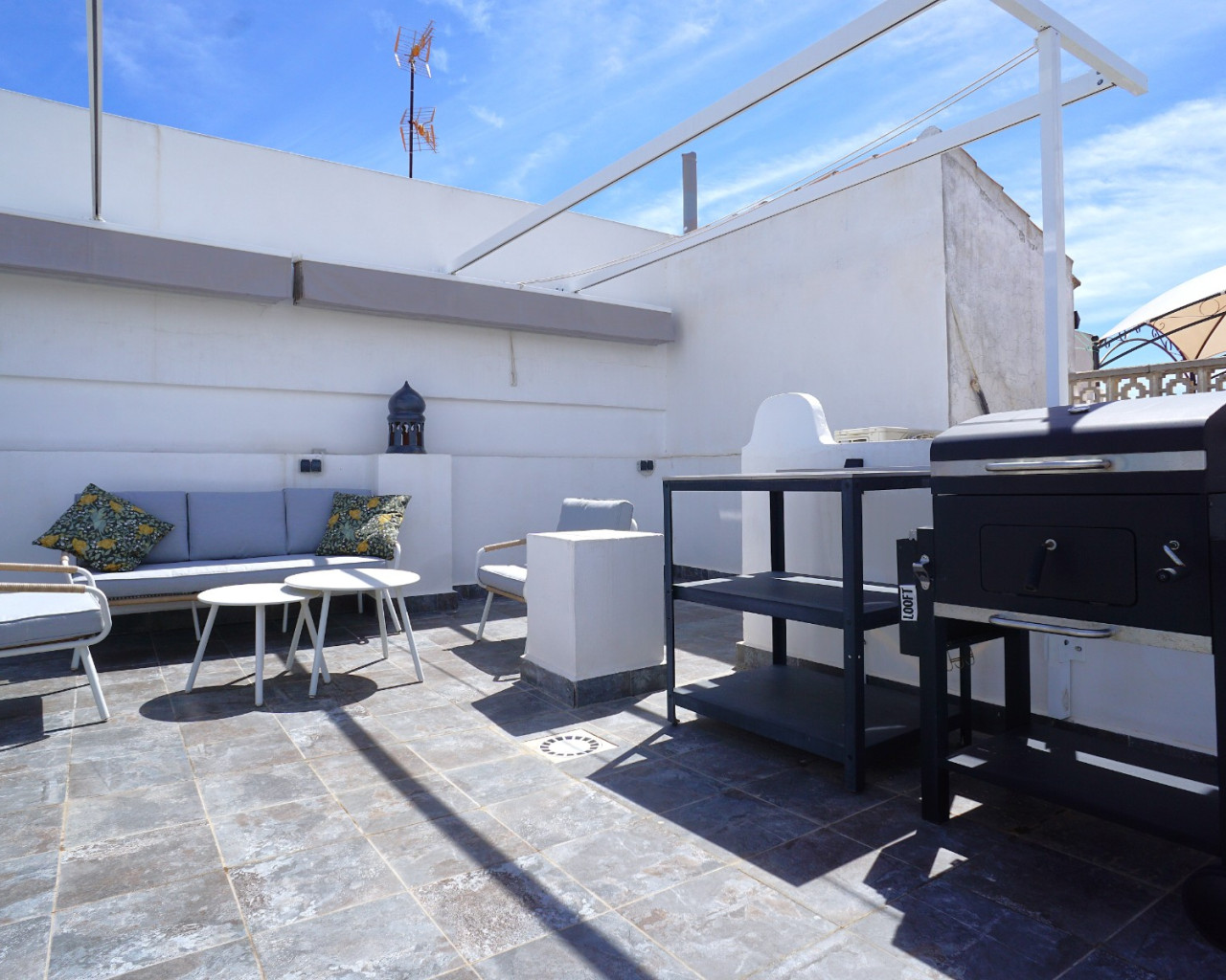 Privé dakterras met ligstoelen en barbecue.